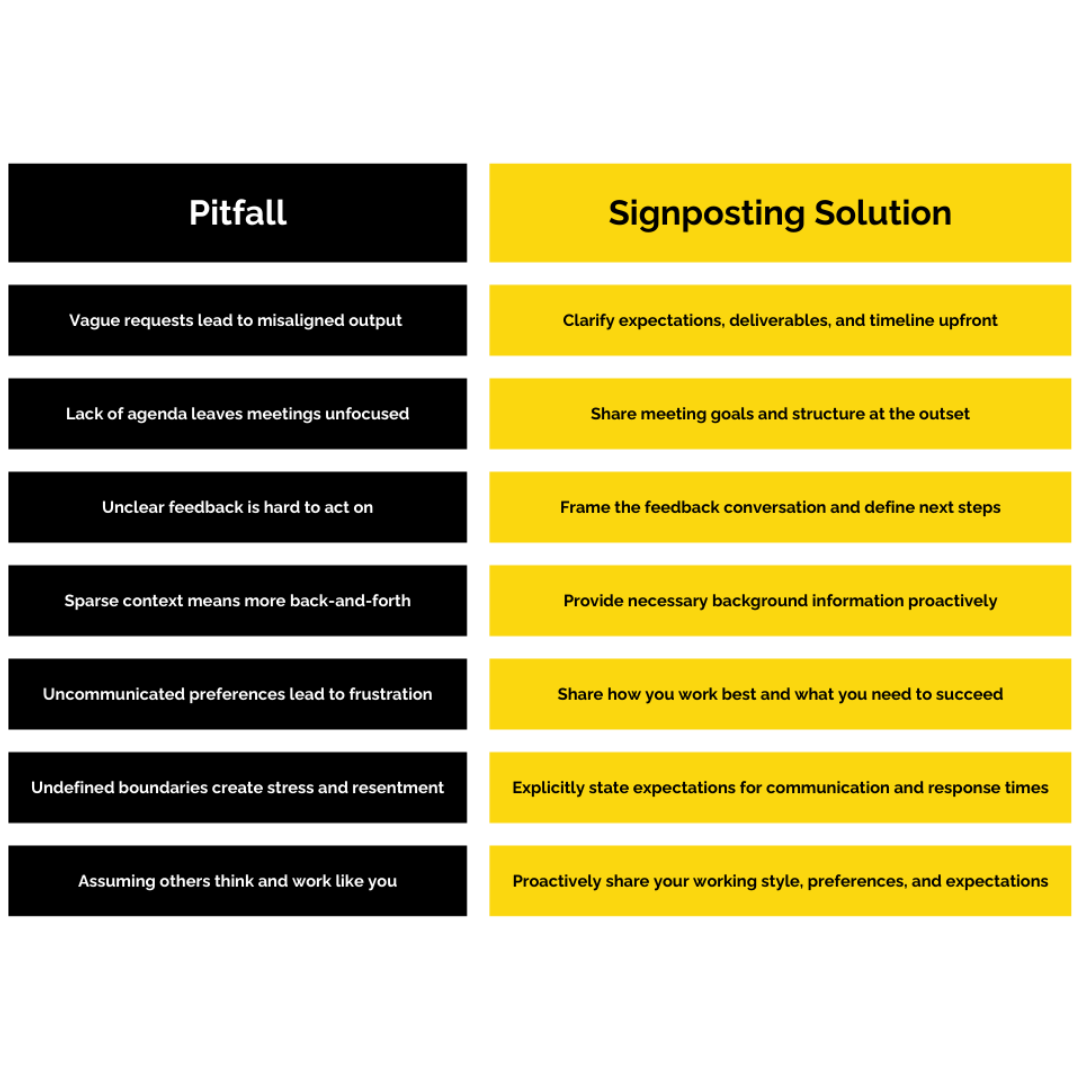 Miscommunication is costly. It erodes trust, stalls progress, and leaves people filling in the blanks with their own assumptions. Signposting is an antidote to ambiguity. By front-loading your interactions with clarity and context, you create a shared understanding and build relational trust over time.